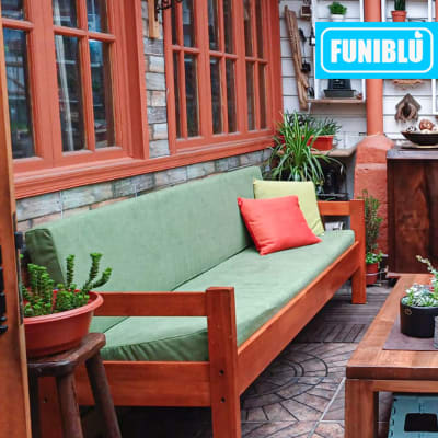 Hermoso proyecto confeccionado con espuma compacta de alta densidad en asientos y respaldos para una estructura que antes de ser este hermoso sofá de terraza que ven ahora, era una litera ¿pueden creerlo? fuimos parte de esta aventura fabricando los cojines en tela de tapicería colección calafate, nuestra colección favorita, en un color verde pistacho seleccionado por nuestros funilovers, ambas piezas con cierres y 100% lavables y para terminar un par de cojines decorativos en colores muy veraneros.