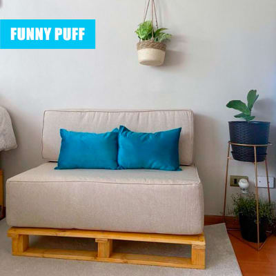 Este proyecto fue para un departamento, nuestra clienta contaba con un palet y nosotros diseñamos para ella la base con una altura especial de 20cm con espuma de alta densidad y un respaldo totalmente independiente de la base con espuma de densidad media, no podian faltar un par de cojines rellenos de algodon para darle el toque decorativo.