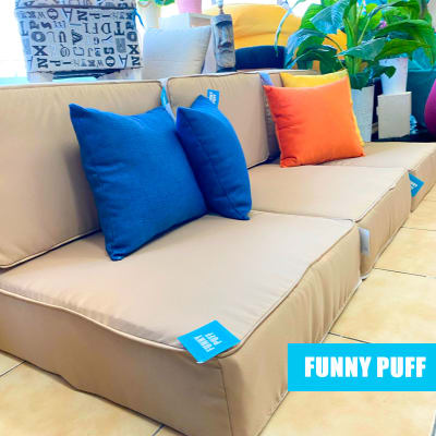 Proyecto de terraza, confeccionado en polylona color beige, relleno de espuma de densidad media, 15cm alto, bases independientes de los respaldos, fundas removibles para lavado o cambio.